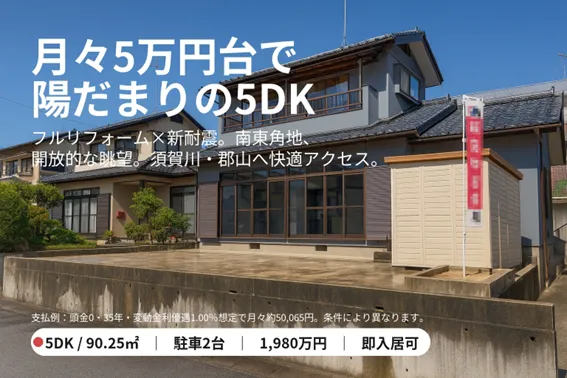 こんなに魅力が詰まったフルリフォーム物件が、なんと1,980万円! 住宅ローンのお支払いも月々5万円台から可能です!アパートが手狭になった方、新しい家族の形を考えている方、ぜひ一度、この素晴らしいお家を実際にご覧になってみませんか?きっと、あなたの「新しい暮らしのイメージ」が膨らむはずです!