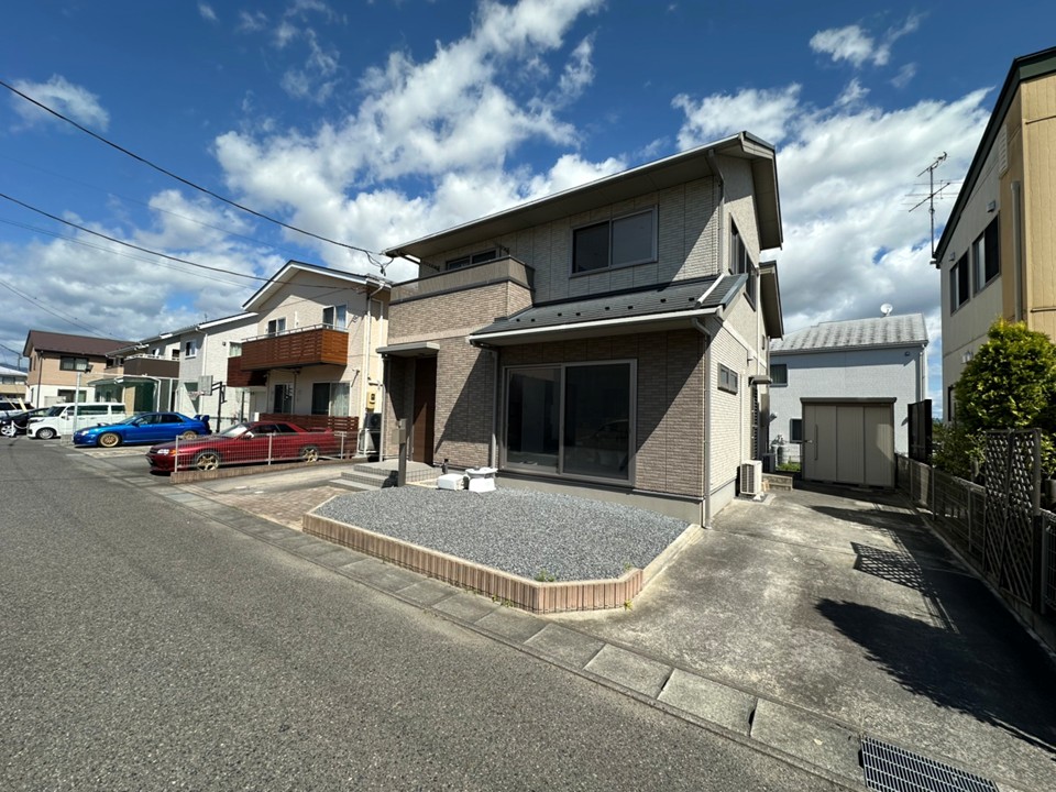 青空に映えるシックな外観。駐車スペースも広々4台分確保されており、来客時やご家族が多いご家庭でも安心です。落ち着いた住宅街の中にありながら、買い物にも便利な立地が魅力です。
