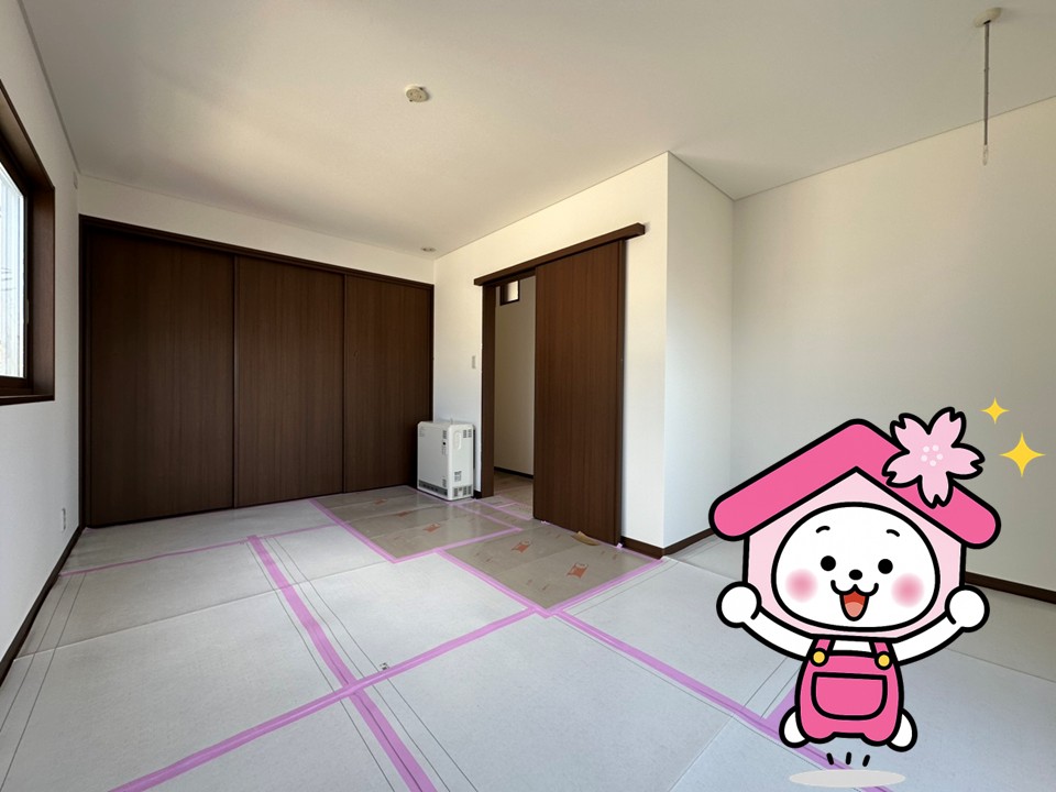 洋室もクロス貼りが完了し、落ち着いた木目の建具がアクセントに。居心地の良い空間に仕上がりつつあります。