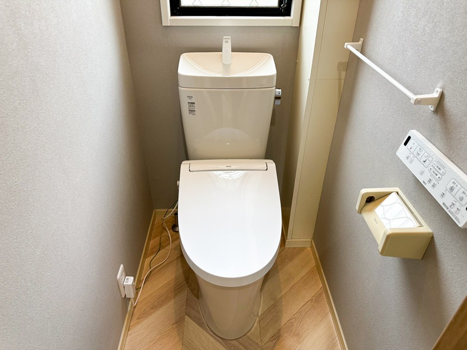 小窓から自然光が入り、明るくて爽やかな印象です☀️温水洗浄便座付きで使い心地も快適。手すりも設置されているので、ご家族みんなが安心して使える空間になっています😊