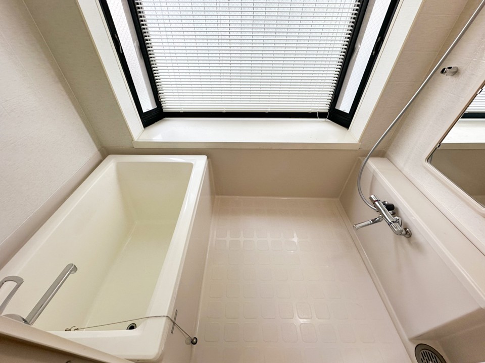 浴室は大きな窓があり、自然光が入る明るい空間☀️清潔感のあるベージュトーンで、毎日のバスタイムが楽しみになります🛁✨ゆったりとした浴槽で足を伸ばしてリラックスでき、1日の疲れをしっかり癒せそうです🌙換気もしやすく、いつでも気持ちよく使えるバスルームです😊