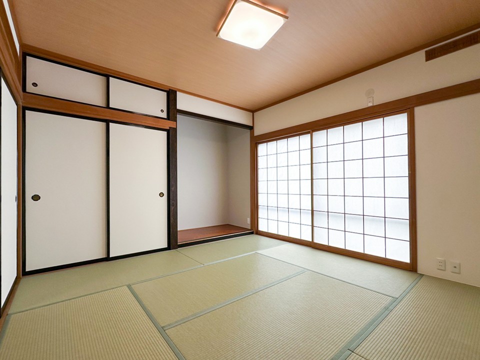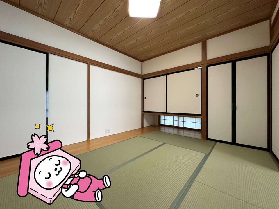 南側の和室は8帖のゆったりとした空間🌿南向きの大きな障子窓からやわらかな日差しが入り、明るく心地よい雰囲気です☀️客間としてはもちろん、家族のくつろぎスペースにもぴったり。畳の香りが広がる、落ち着いた時間を過ごせるお部屋です🍵