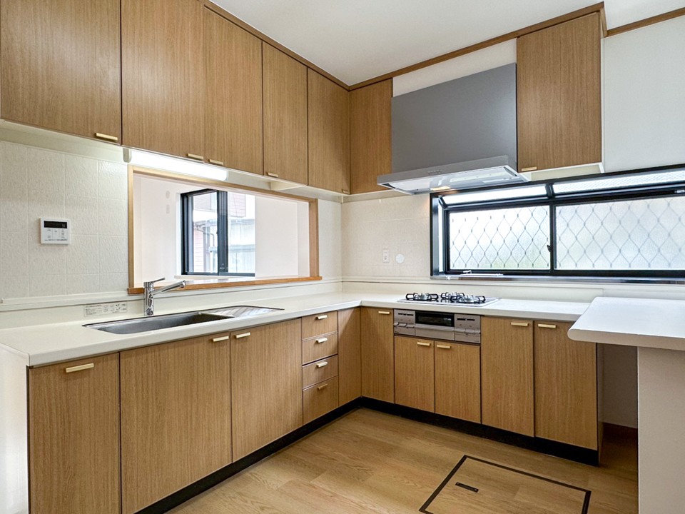 木目調のシステムキッチンは、温かみがありながらもスタイリッシュ✨L字型のレイアウトで作業スペースも広く、動きやすい設計になっています🍳