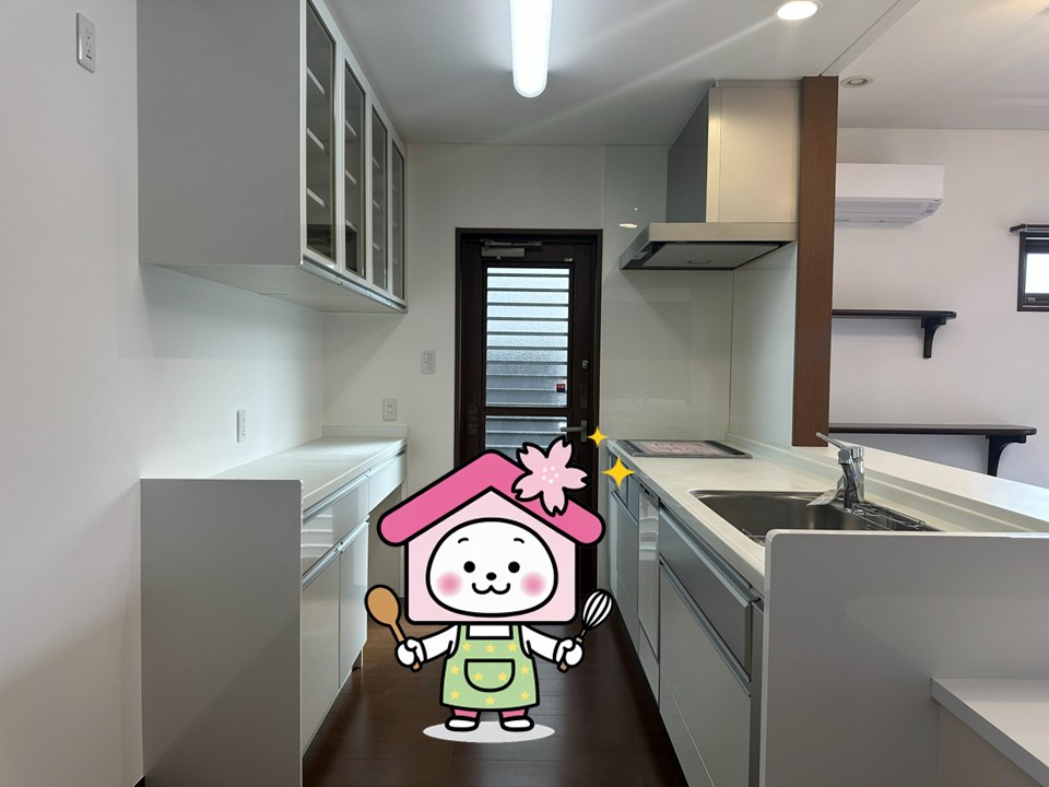 手元が見えにくい高さのカウンターで、急な来客時もすっきり。背面には吊戸棚とカウンター収納を備え、調理家電や日用品をまとめて管理できます。勝手口で換気がしやすく、家事動線も軽快です。