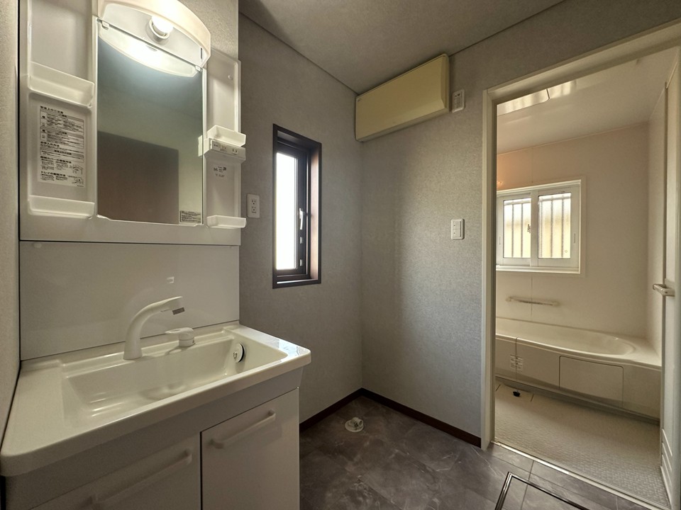 脱衣室は窓でしっかり換気でき、湿気がこもりにくい設計。洗面台まわりは収納と作業スペースが確保され、タオルや日用品も出し入れしやすく整います。隣接する浴室へスムーズにアクセスでき、家事効率も◎。