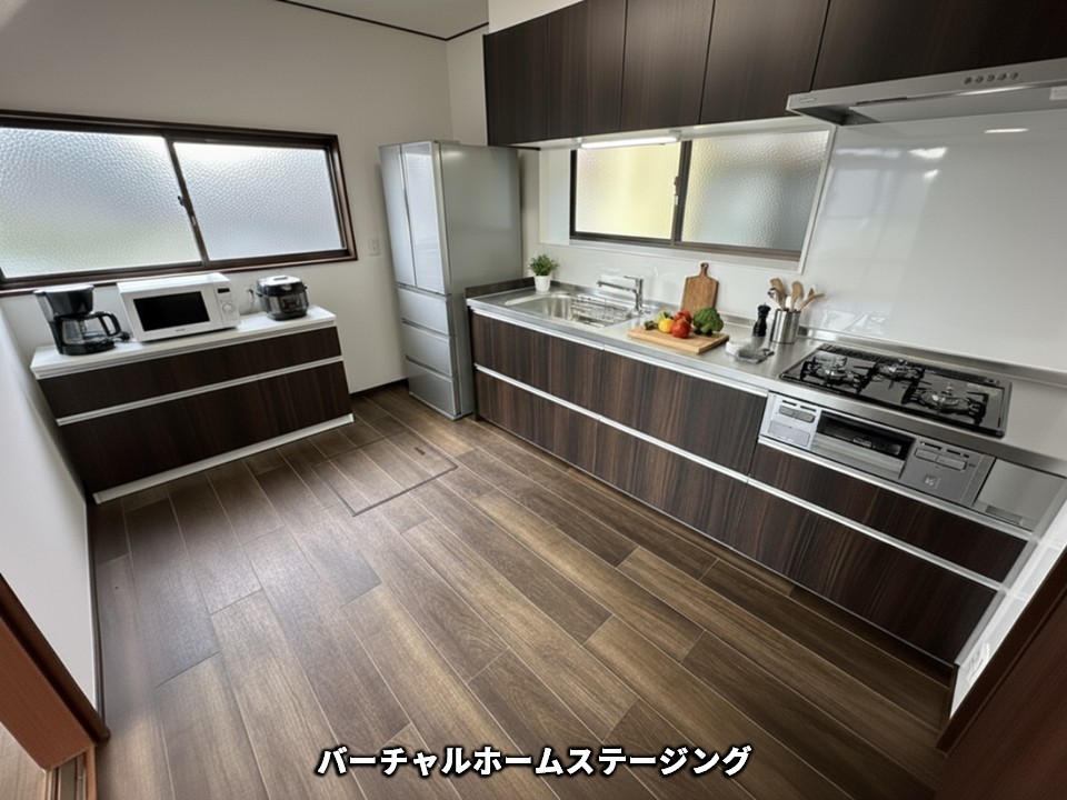 キッチンの面材と床色に合わせ、食器棚をバーチャルでコーディネート。トーンを揃えると、より上質でまとまりのある印象に。🌿