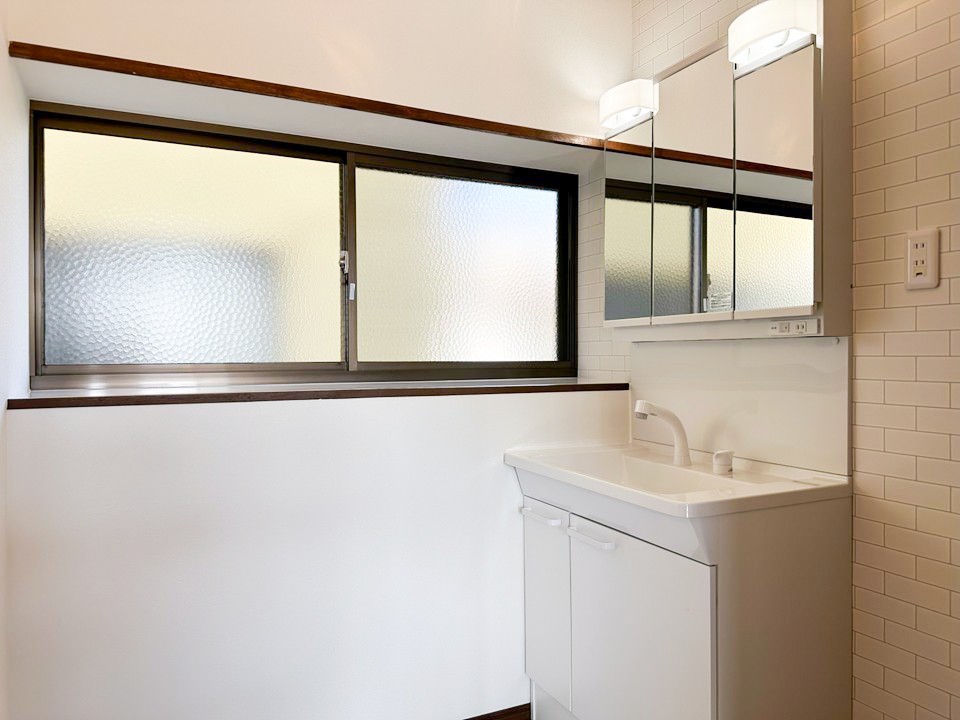 洗面化粧台も新しくなりました。三面鏡の裏にも収納が隠れていますよ♪