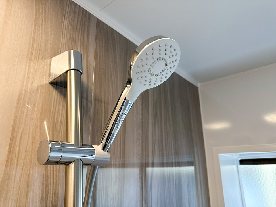 ワイドなシャワーヘッドで、全身を包み込むような水流に。節水タイプで、使い心地とエコを両立しています。