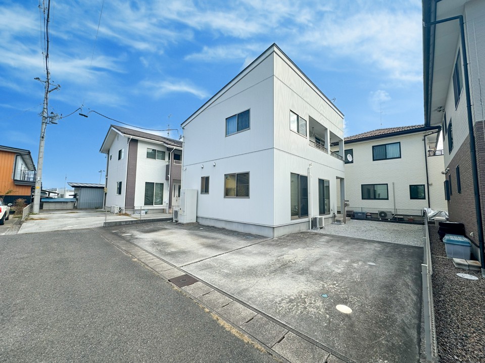 外観はスタイリッシュで洗練された印象✨白い外壁がとても爽やかで清潔感があふれるお家です 😊駐車スペースも広く、3~4台駐車可能です 🚗 🚗🚗 🚗