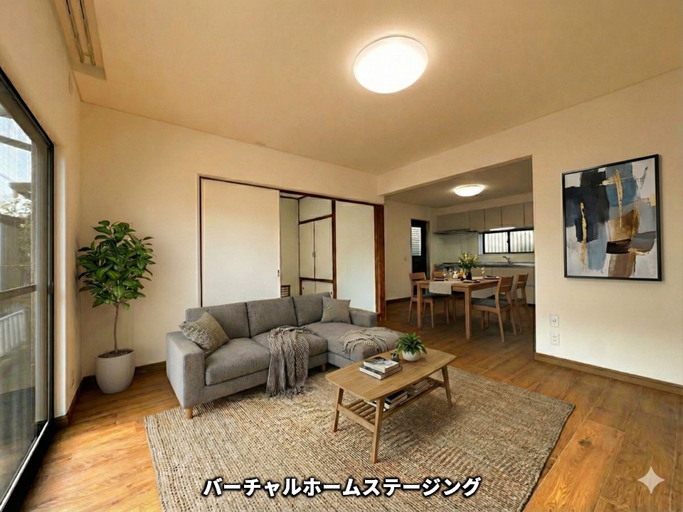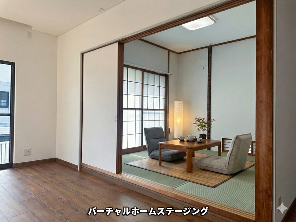 バーチャルホームステージングでは、落ち着いた色合いの座椅子やローテーブルを配置し、和室ならではの“ほっと落ち着く雰囲気”を引き立てています。障子越しに入る柔らかな光と、畳の質感が調和し、心がゆるむような穏やかな空間に。照明や観葉植物をアクセントとして加えることで、シンプルながらも上質なコーディネートに仕上げました。