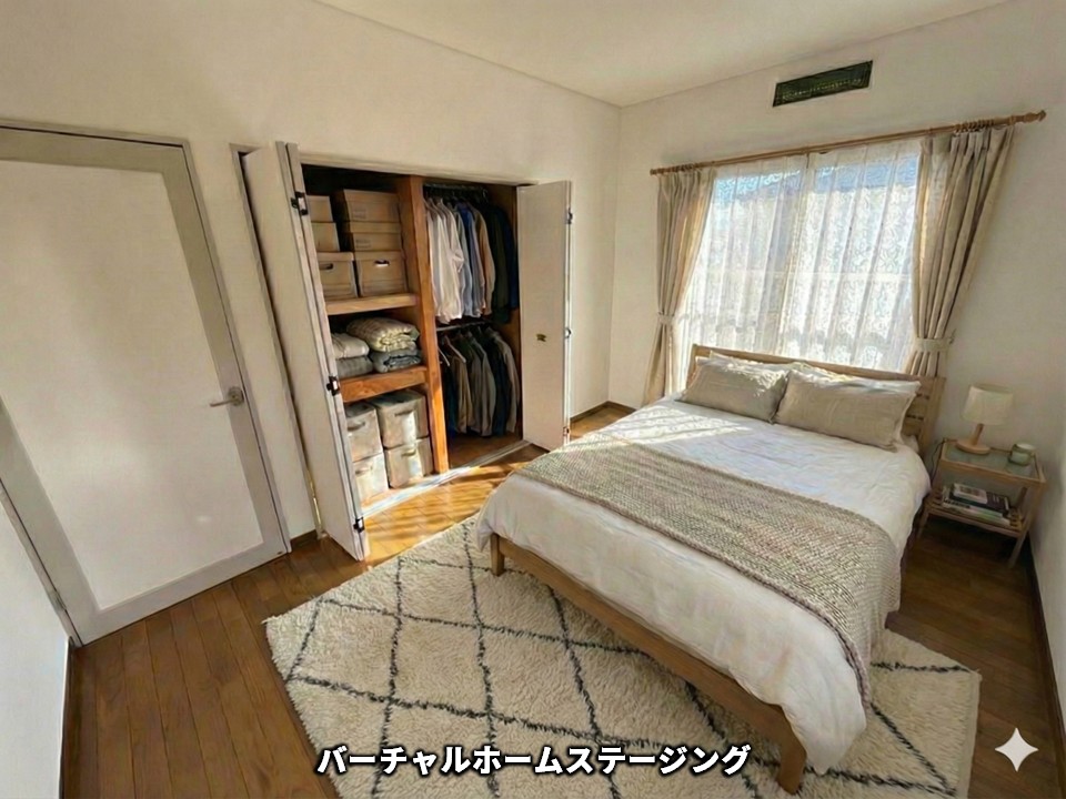 バーチャルホームステージングでは、シンプルで清潔感のあるベッドリネンを選び、明るいトーンのカーテンと合わせることで、ゆったりと心地よく過ごせる空間を演出しました。ベッドサイドにはナイトテーブルを配置し、日々の生活に欠かせない“ちょっとした便利さ”も感じられるようコーディネートしています。
