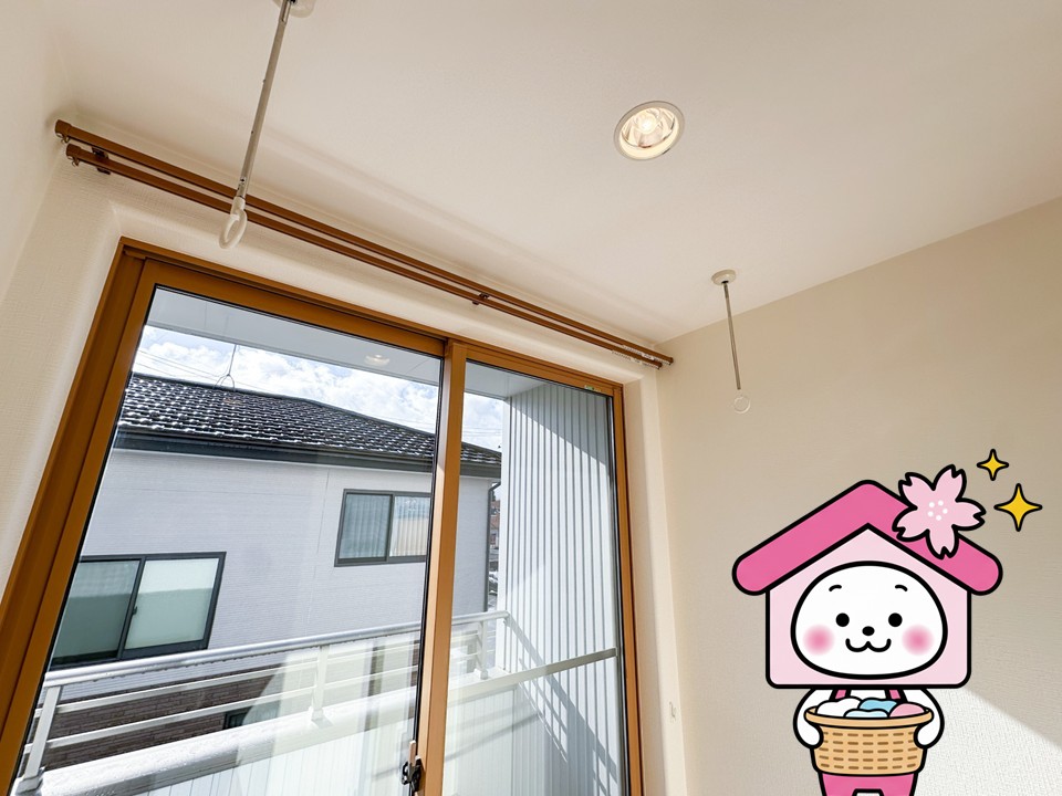見てくださいこの便利アイテム!👀✨ 天井に設置された「ホスクリーン」のおかげで、お天気や花粉を気にせず室内にお洗濯物が干せちゃいます🧺👕 急な雨でも安心、これで毎日のお洗濯がもっと楽になりますね!